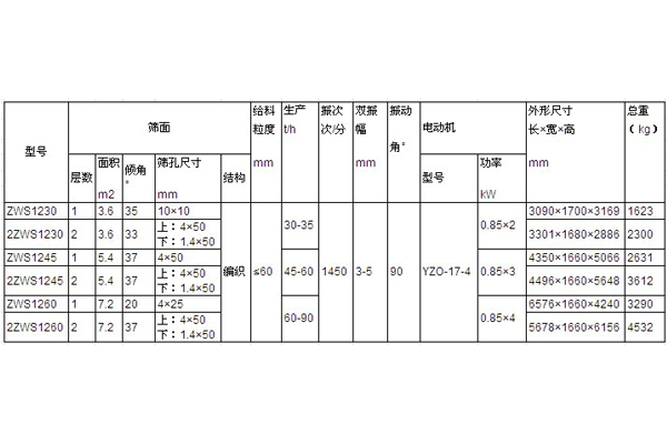 ZWS型振網(wǎng)篩是以振動電機做為振動源,牽引篩網(wǎng)及篩框振動,實現(xiàn)物料分級。ZWS振網(wǎng)篩由給料器、篩箱篩面機體料斗和振網(wǎng)裝置組成。材料由給料器均勻給到篩面,分成篩上產(chǎn)品與篩下產(chǎn)品(單層篩)。本系列振網(wǎng)篩以振動電機為振動源,牽引篩網(wǎng)上下振動,篩機振幅可調(diào),以適應(yīng)不同物料的分級。篩網(wǎng)的振動,一方面可防止篩網(wǎng)堵塞,同時使物料拋起向前彈跳實現(xiàn)分級,因而振網(wǎng)篩的篩分效率高。 ZWS型振網(wǎng)篩主要特點: 1.密封防塵,維修方便。 2.篩機振幅可調(diào),篩分效率高。 3.生產(chǎn)能力大,動負荷小,噪音低。參數(shù)